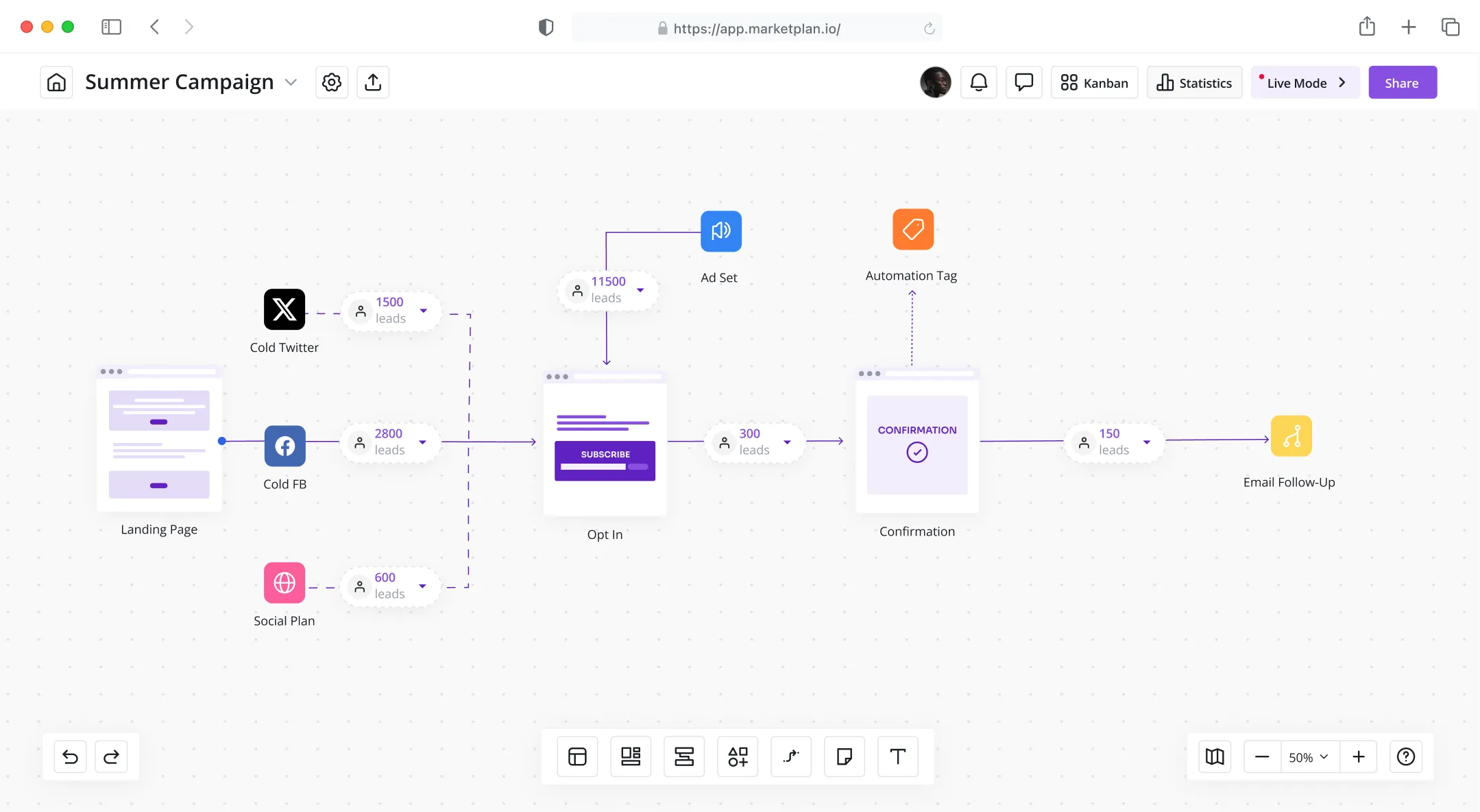 Visualize the customer journey and improve lead generation. Design, track, and analyze effectiveness of various stages within the sales conversion process. With MarketPlan, it's easier and more efficient than ever.